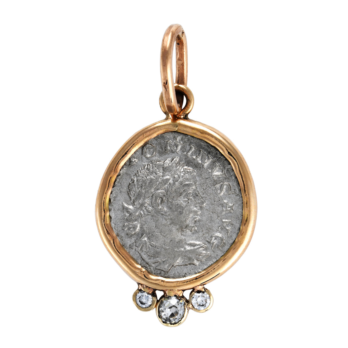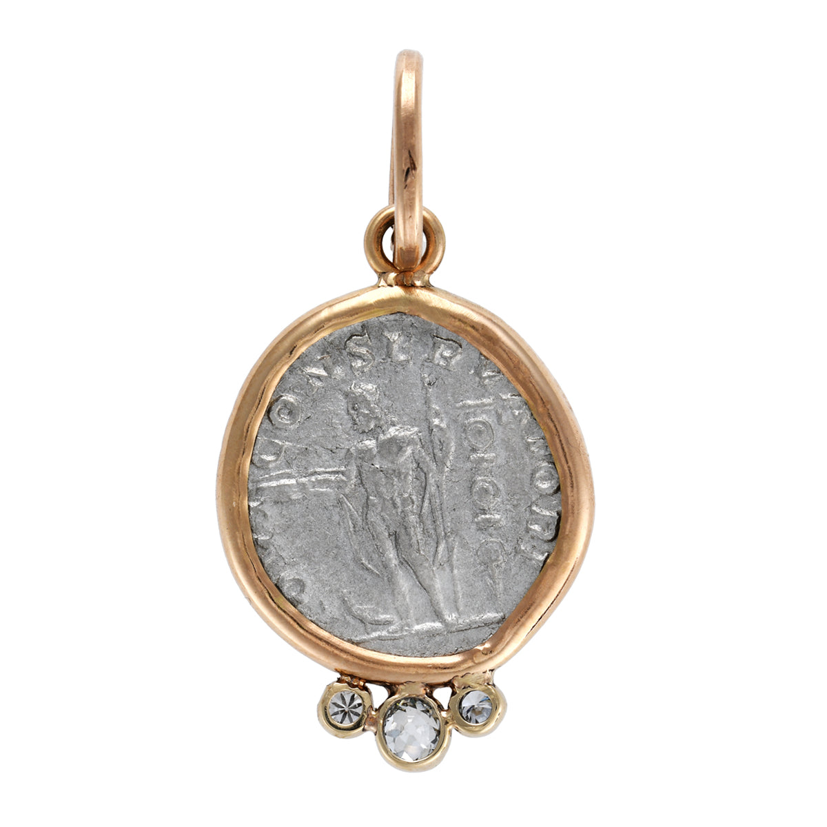 Materials: Silver coin set in 14 karat yellow gold carrier adorned with three old rose cut diamonds.