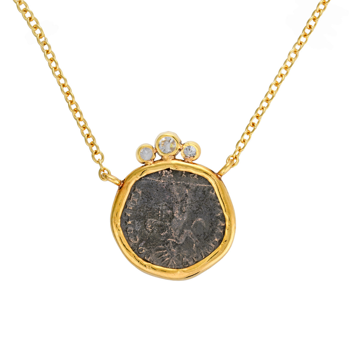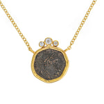 Materials: Bronze coin set in 14 karat yellow gold carrier adorned with three old rose cut diamonds.