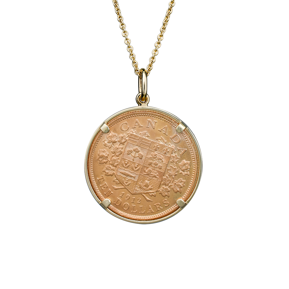 Canada gold 10 dollar 1912 coin in 22 karat yellow gold coin set in 14 karat yellow gold pendant.