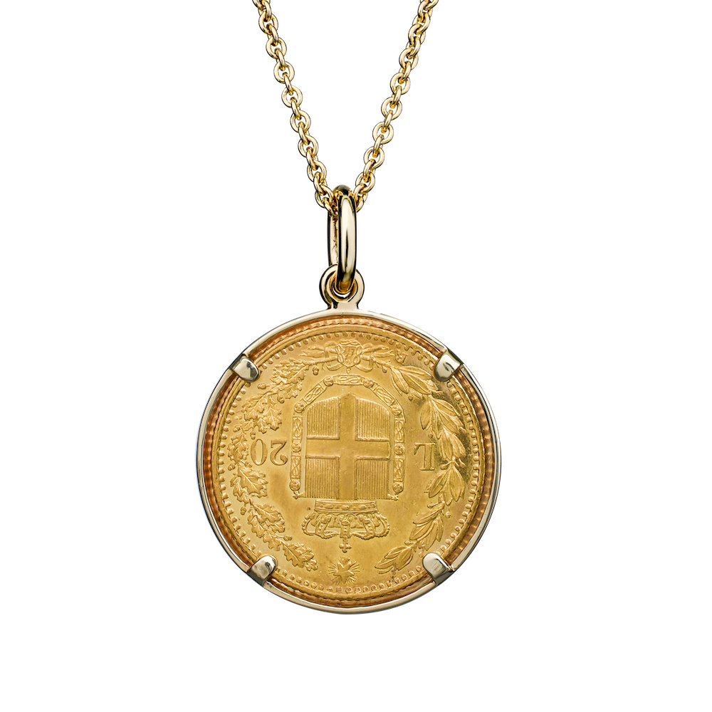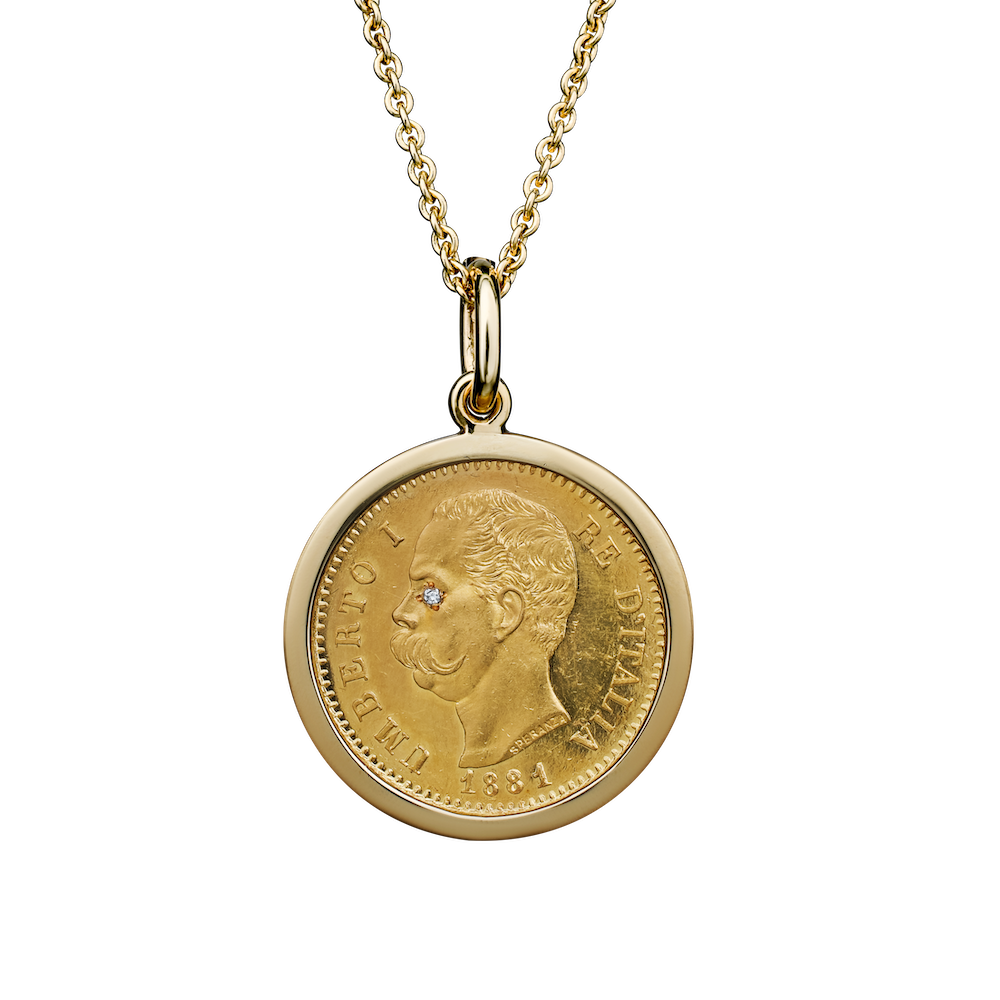 Italian gold 20 lira 1881 coin in 22 karat yellow gold coin set in 14 karat yellow gold pendant.