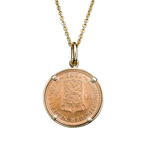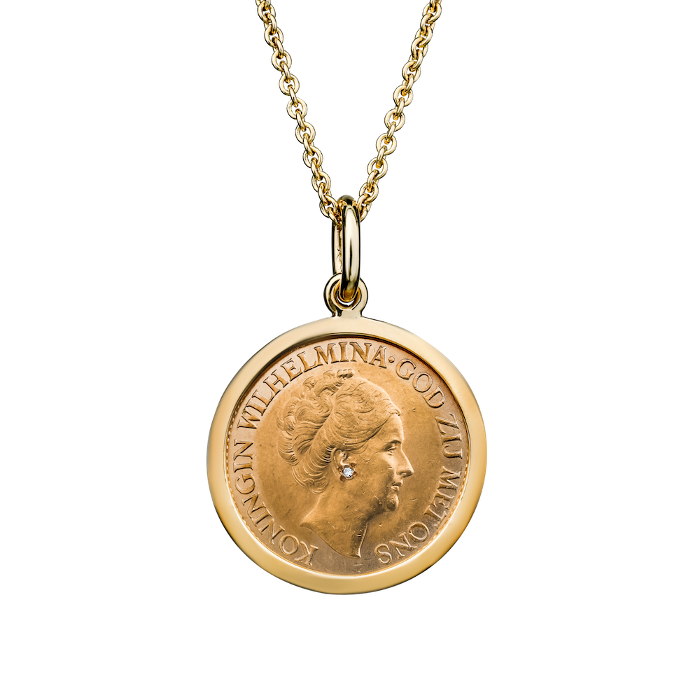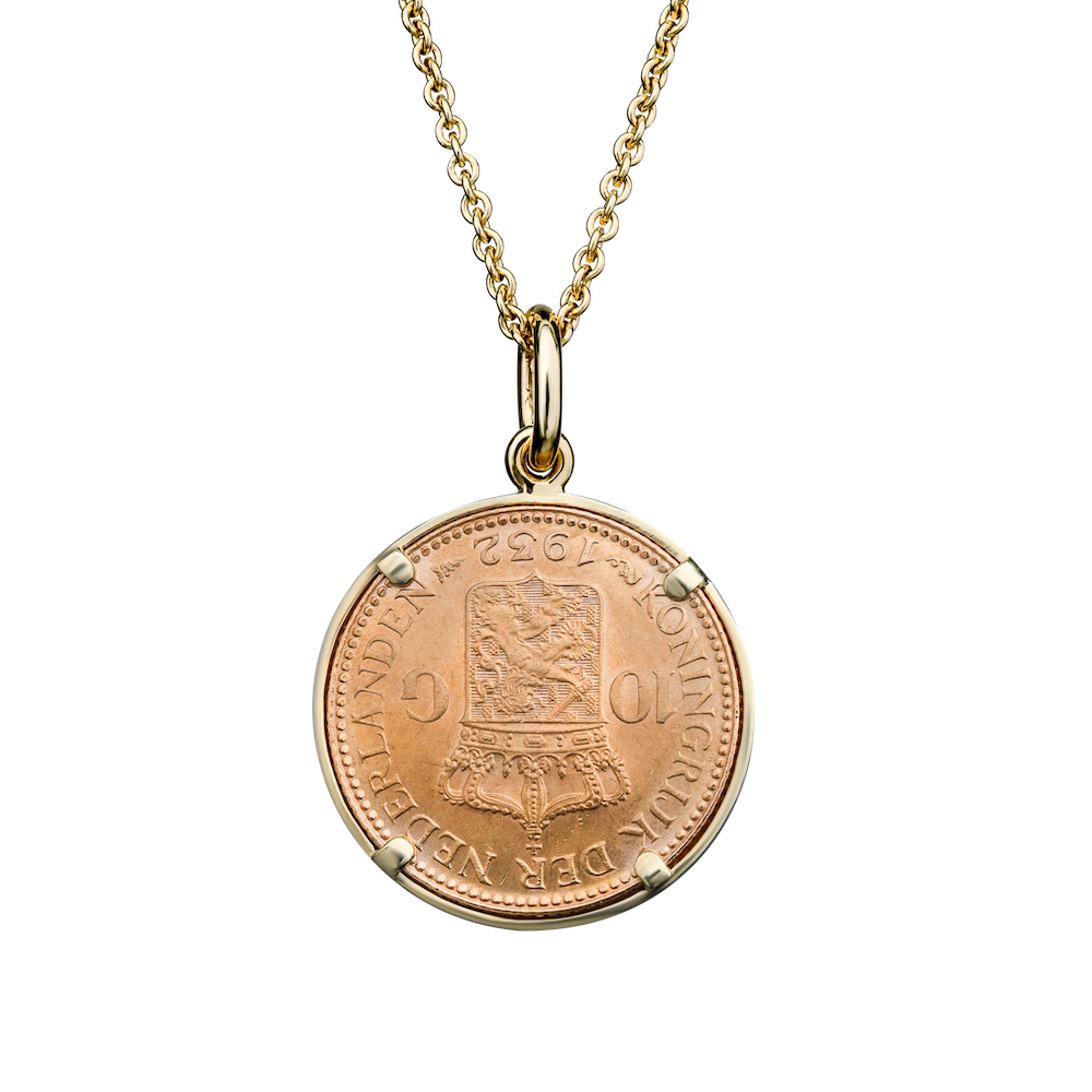 Dutch gold 10 gulden 1932 coin in 22 karat yellow gold coin set in 14 karat yellow gold pendant.